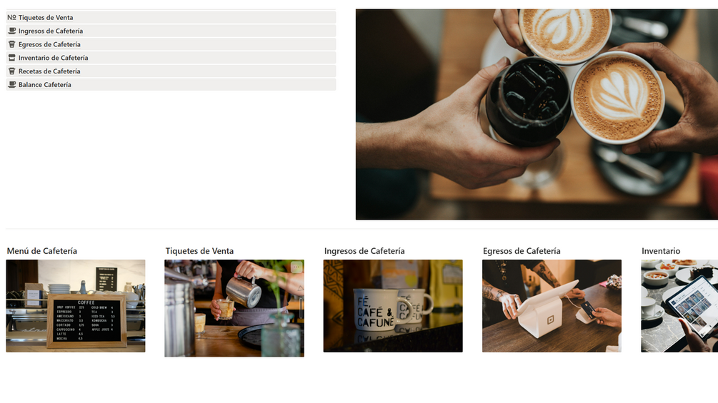 Simplifica la gestión de tu cafetería y maximiza tus ganancias con este panel de control de Notion totalmente automatizado. Menú, Tickets, Recetas, Ingresos, Egresos, Balances, Inventario, todo en un mismo lugar.