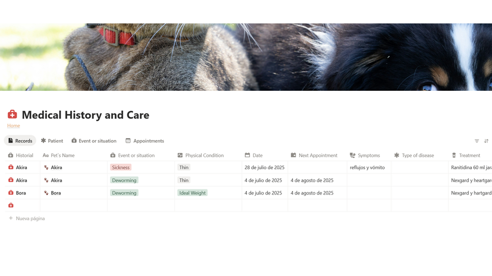 "Pet Center" is your command center for everything related to your furry, feathered, or scaly friends. This Notion template is much more than a simple organizer: it's a complete, interconnected system that helps you keep a detailed record of every aspect of their life.